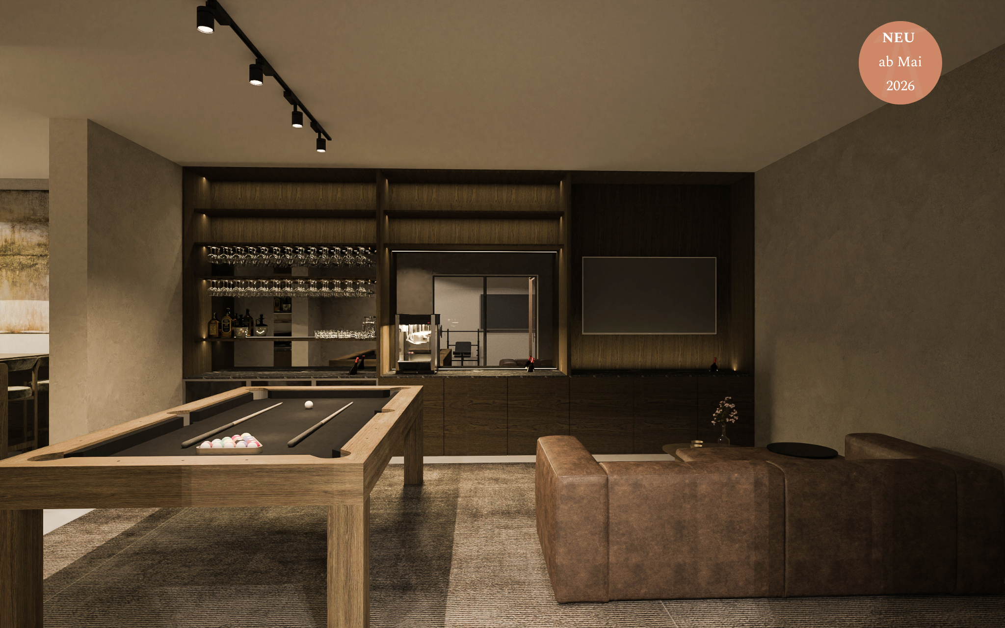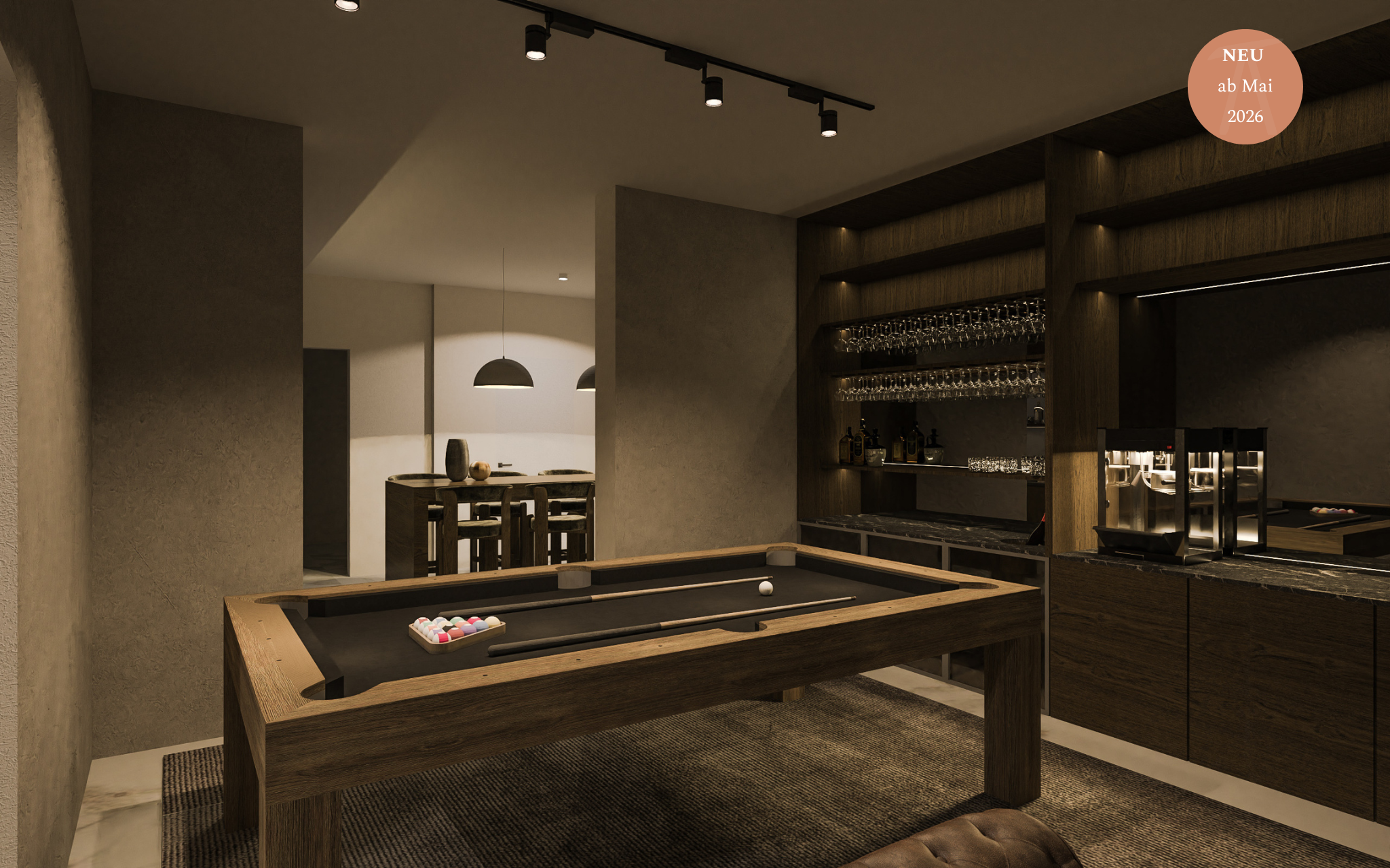 Im Untergeschoss der Villa entstehen Bereiche für Entspannung und Unterhaltung, in denen Sie in Ruhe und Privatsphäre ein leichtes Training, ein Glas Wein oder einen Abend mit Billard und einem Film genießen können.
